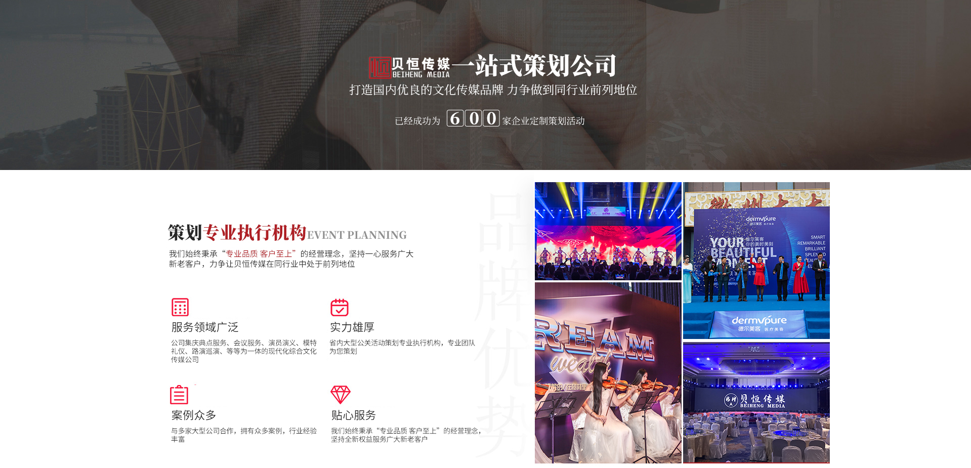 - 合 肥 貝 恒 文 化 傳 媒 專注·專業·專心·效率 合肥貝恒文化傳媒有限公司2017年成立于安徽·合肥,是省內大型公關活動策劃專業執行機構,公司集慶典服務、會議服務、演員演藝、模特禮儀、路演巡演、展會特裝、廣告制作、設備租賃、舞美策劃、企業形象宣傳等為一體的現代化綜合文化傳媒公司,我們始終秉承“專業品質客戶至上”的經營理念,堅持全...